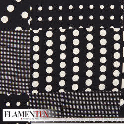 Polka dot printed georgette fabric with different sizes of polka dots making squares.