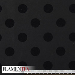 Stretch satin fabric with flocked polka dots. Ideal for fitted flamenco dresses.