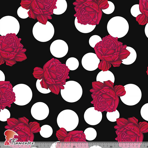 Very drapey crepe fabric. Pattern of flowers and irregular polka dots.