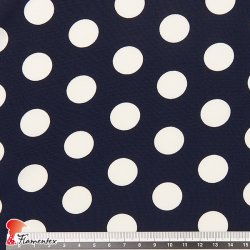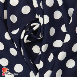 Tejido de crespón tipo georgette, con algo de elasticidad. Estampado de lunares de 2,00 cms.