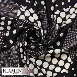 Tejido tipo georgette estampado de lunares con diferentes tamaños de lunares haciendo cuadros.