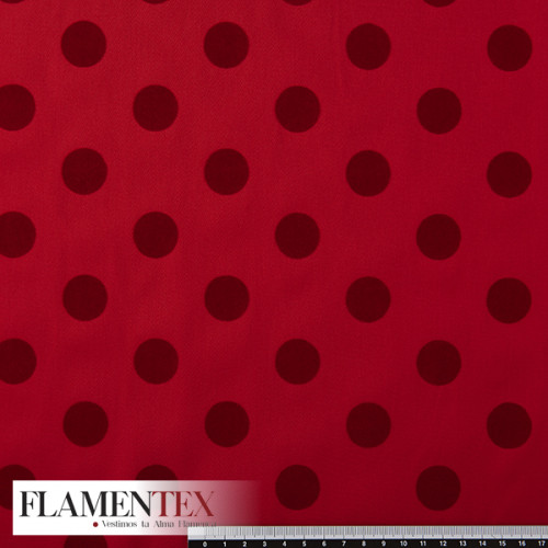 Tela satinada elástica con lunares flocados de 2,30 cms. aprox., perfecta para trajes de flamenca muy entallados.