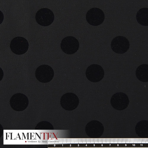 Tela satinada elástica con lunares flocados de 2,50 cms., perfecta para trajes de flamenca muy entallados.