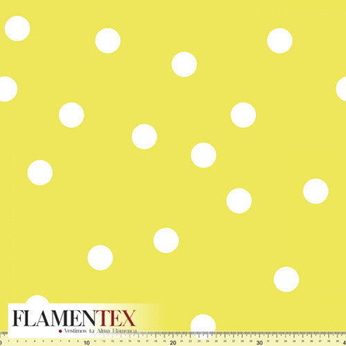 Tejido de apariencia de lino, con algo de elasticidad. Estampado de lunares dispersos de 2,50 cms.