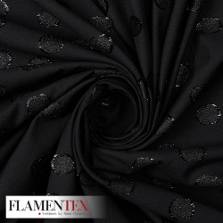 Tejido tipo plana adornado con lunares de 3,50 cm., más los flecos de 0,50 cm.